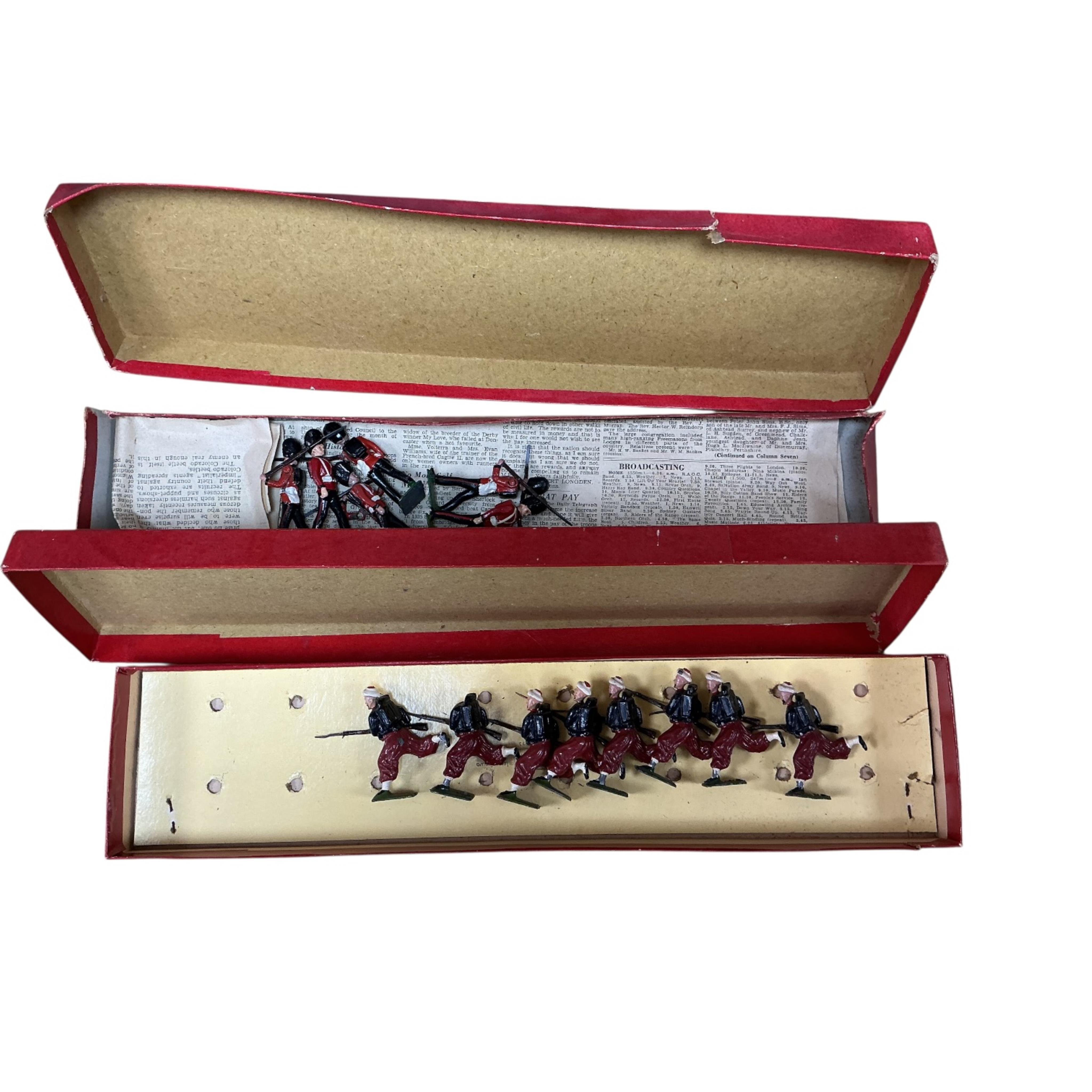 Lot 111 , Five boxed partial sets of Britains lead soldiers; ‘British Soldiers’; Royal Welsh Fusiliers (No.74) (6 figures), The Life Guards with cloaks (2 figures) (No.400), and three ROAN boxed sets; Skinner’s Horse (4 figures) (