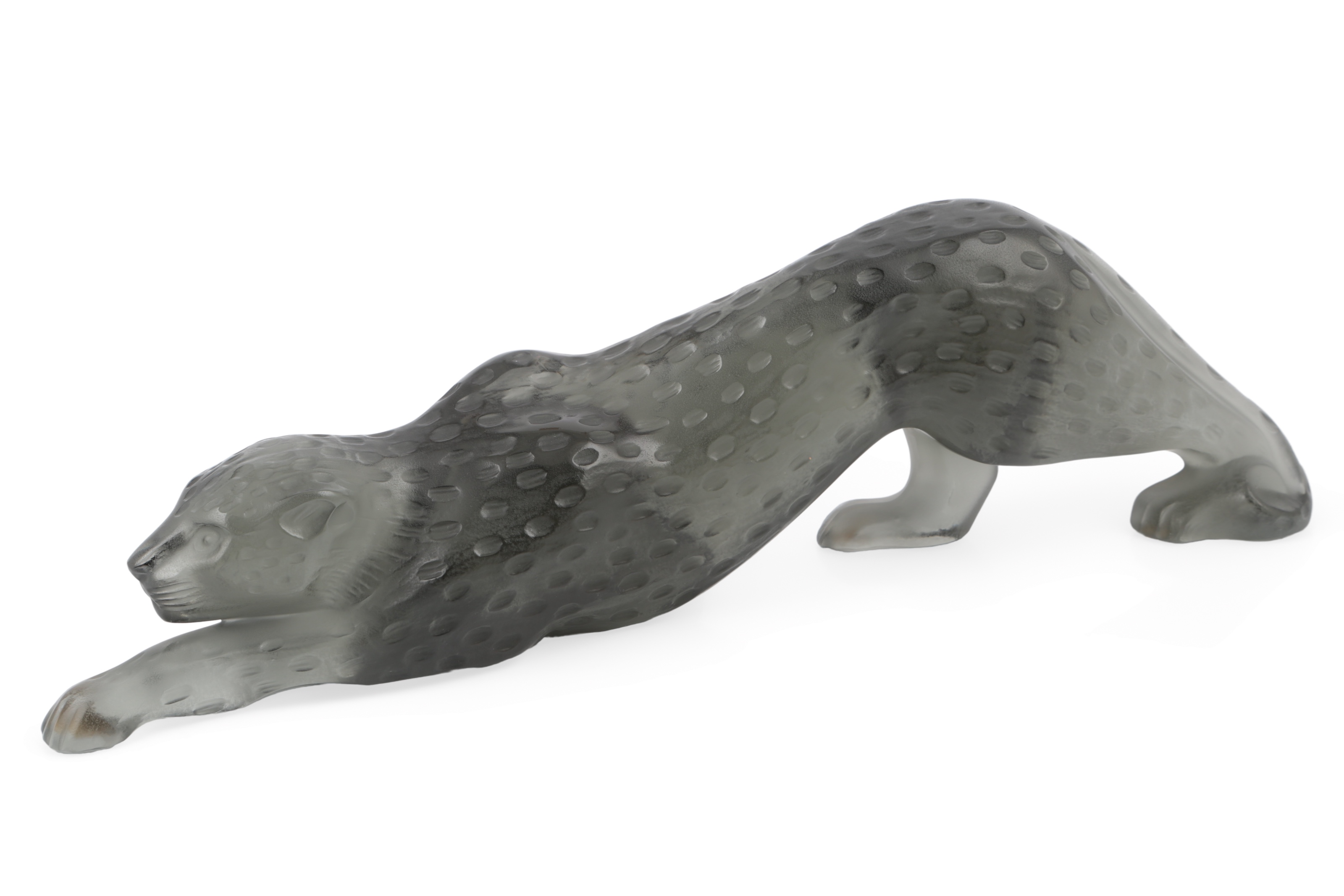 Lalique: A 'Zeila Panther', designed in 1989 by Marie-Claude Lalique, naturalistically modelled in stalking pose, dark graphite coloured glass, etched signature "Lalique, France" to a paw, 37.5cm long, in original fitted box