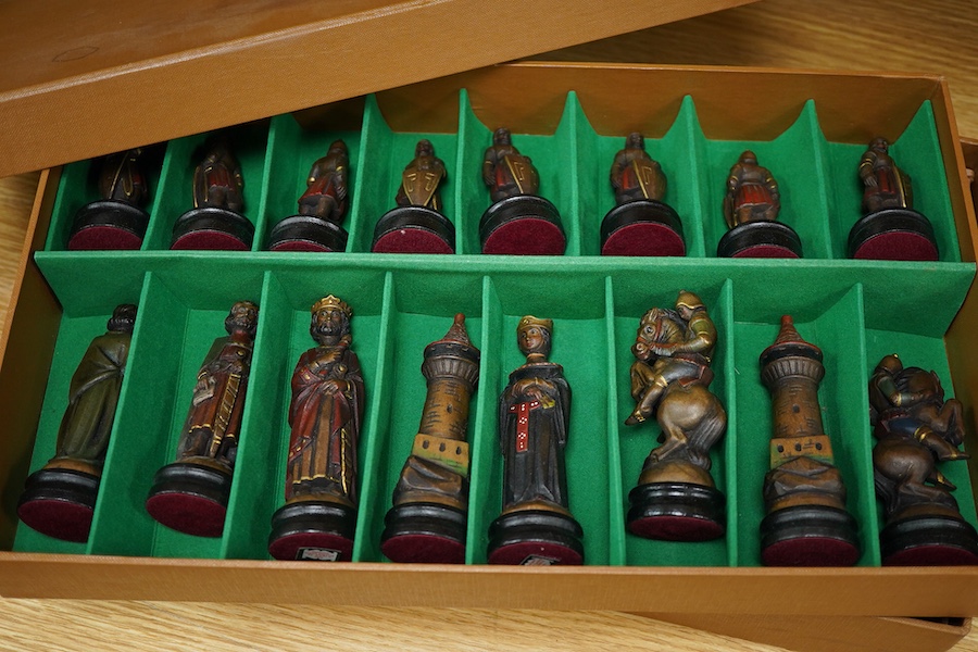 An Italian Anri carved wood King Arthur chess set, kings 11cm, boxed
