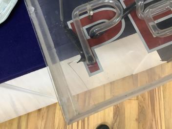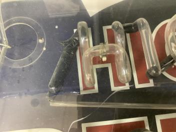 Electrically tested and not working. Perspex cracked at P; no damage seen to glass piping but some cracks to the black connectors.