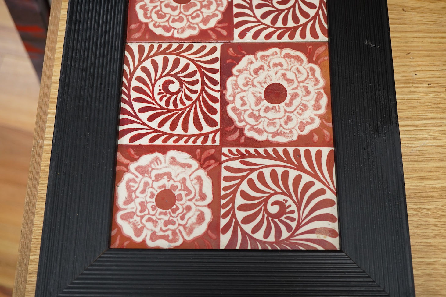 A William de Morgan style ruby lustre ‘rose and scroll’ tile panel, framed, overall 68.5cm high.
