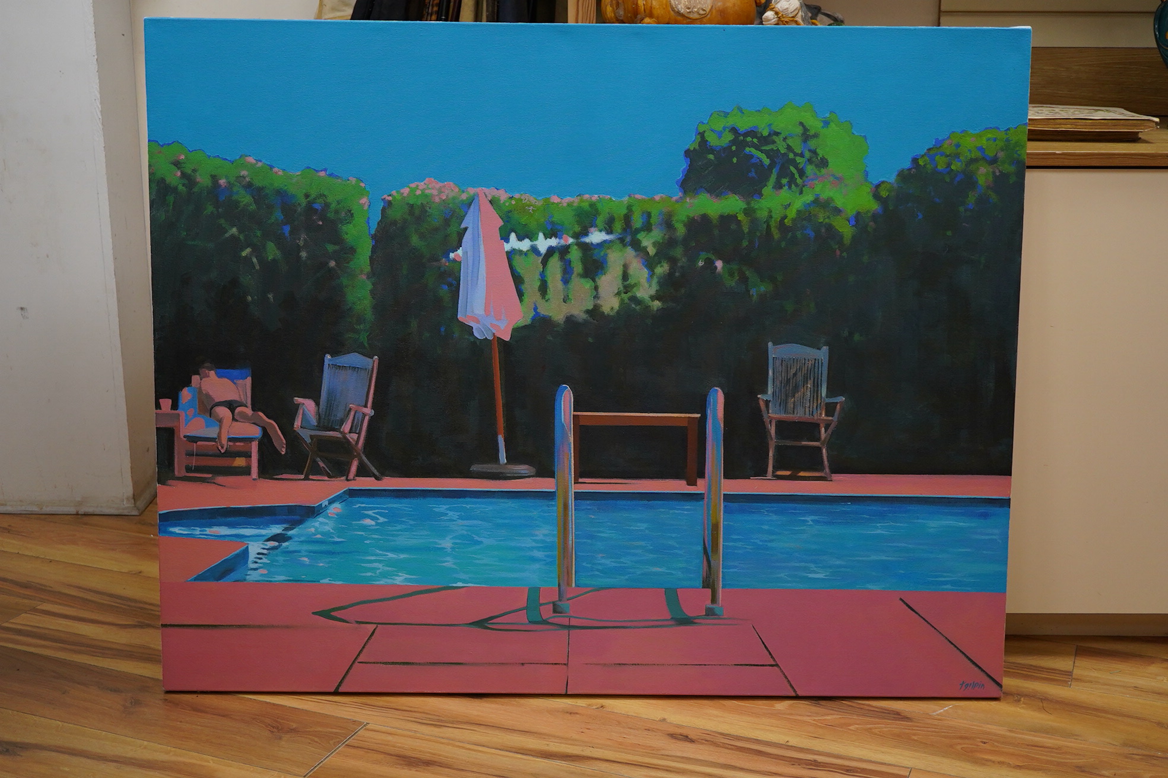 Contemporary, poolside view with figure, indistinctly signed, oil on canvas, unframed, 91 x 117cm