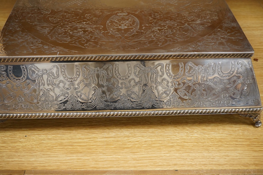 A silver plated cake plateau with etched decoration, 46cm square at base