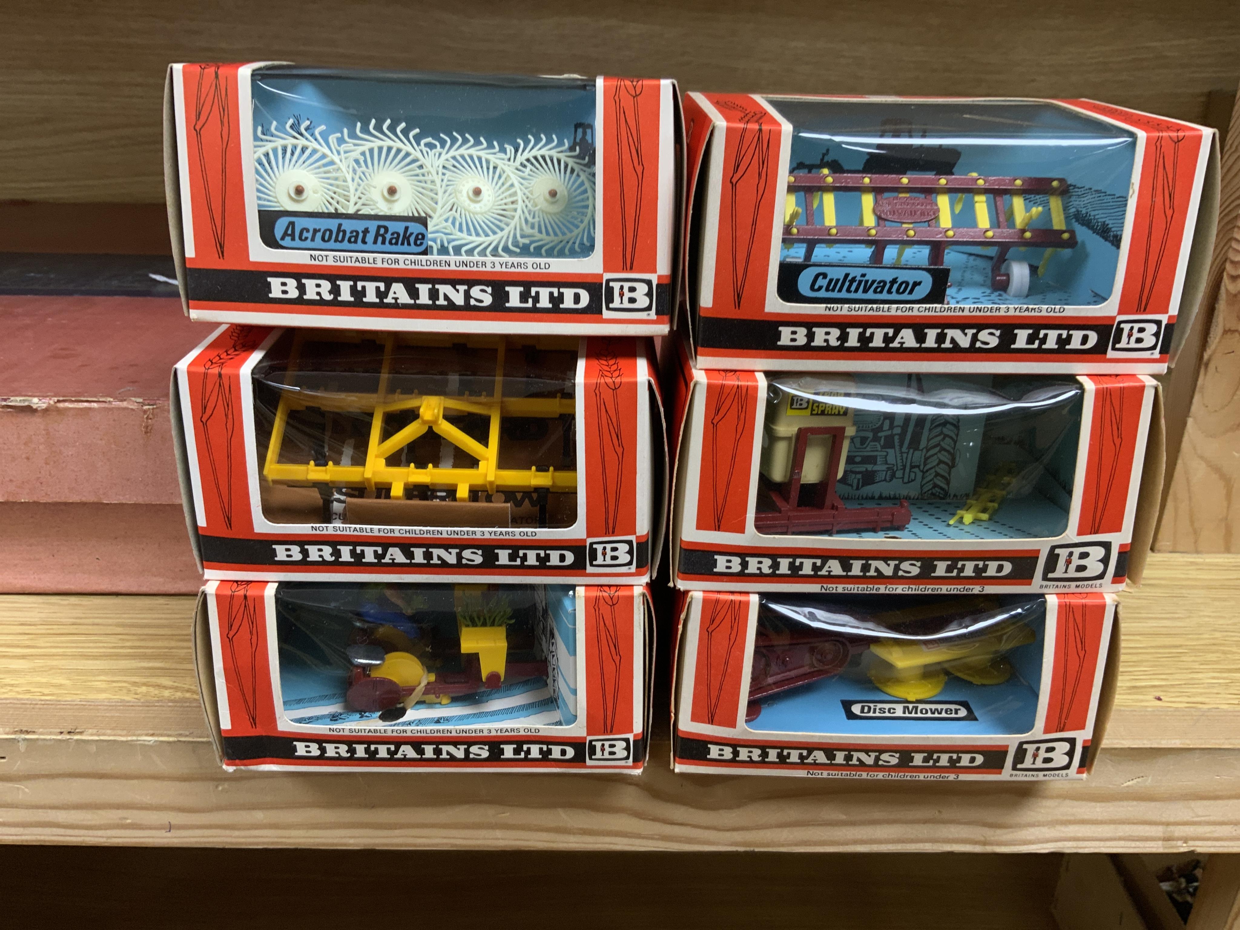 Ten 1970s boxed Britains Farm Models; transplanter (9552), vari-spreader (9538), cultivator herse (9561), muledozer (9535), disc harrow (9553), disc mower (9544), crop sprayer (9548), cultivator (9536), acrobat rake (9537), and a post hole digger (9600)
