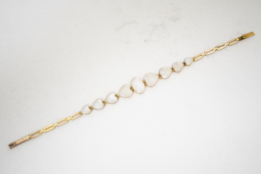 Lot 1156 , A moonstone bracelet, centring on a series of links set with oval and heart-shaped moonstone cabochons, to a link bracelet, mounted in gold, length 17cm, gross weight approximately 5 grams