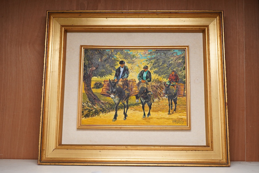 Paolo Fabbro (Italian, b.1941), Harvesters on donkeys, signed and dated ‘78, oil on canvas, 29 x 39cm