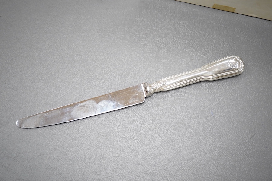 Lot 829 , A set of six modern silver fiddle, thread and shell pattern table knives and six matching dessert knives, Yates Brothers, Sheffield, 1995/96.