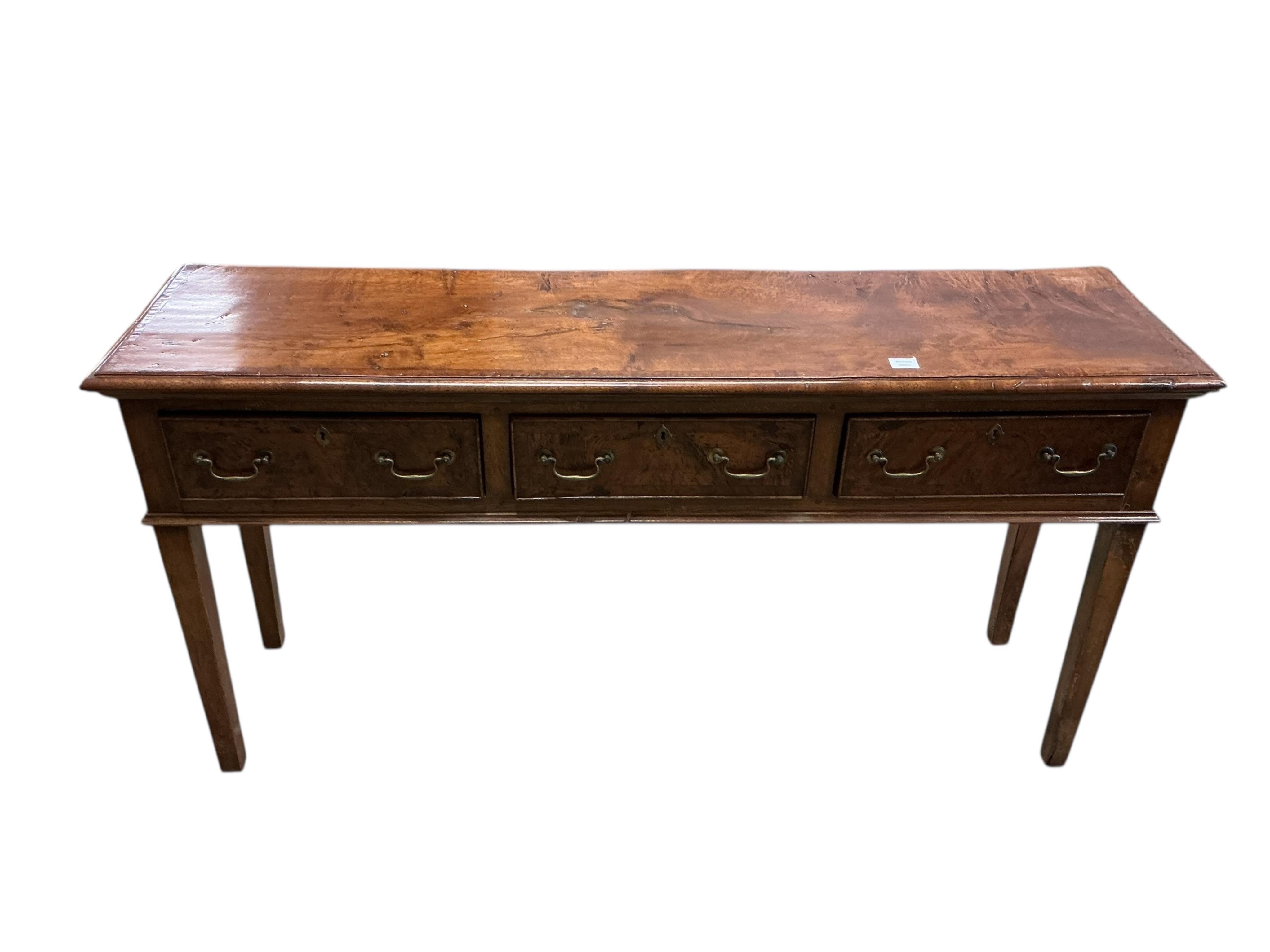 An 18th century style oak three drawer low dresser, width 168cm, depth 43cm, height 86cm