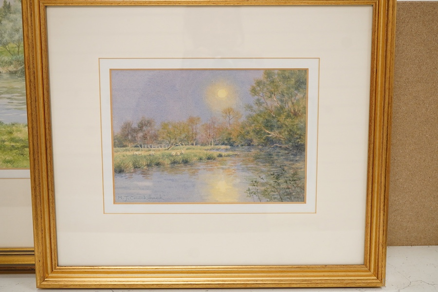 Lot 1753 , Michael J. Cruikshank (contemporary), ‘Riverside Pastures’ and ‘Watery Moon Reflections’, each signed, Bradness Gallery labels verso, two watercolours, largest 30 x 52cm