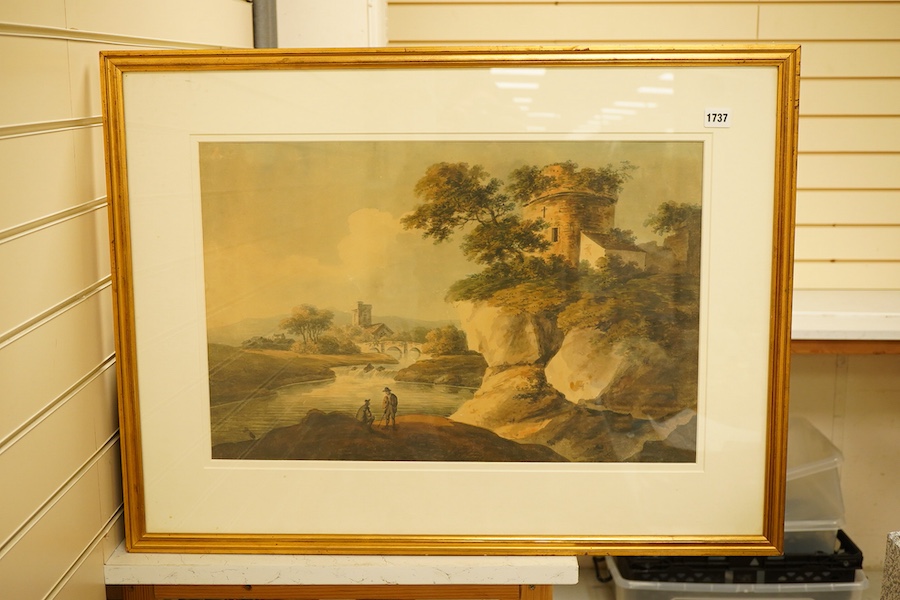Lot 1737 , 19th century, English School, Figures beneath a stone tower beside a river, watercolour, 39 x 60cm