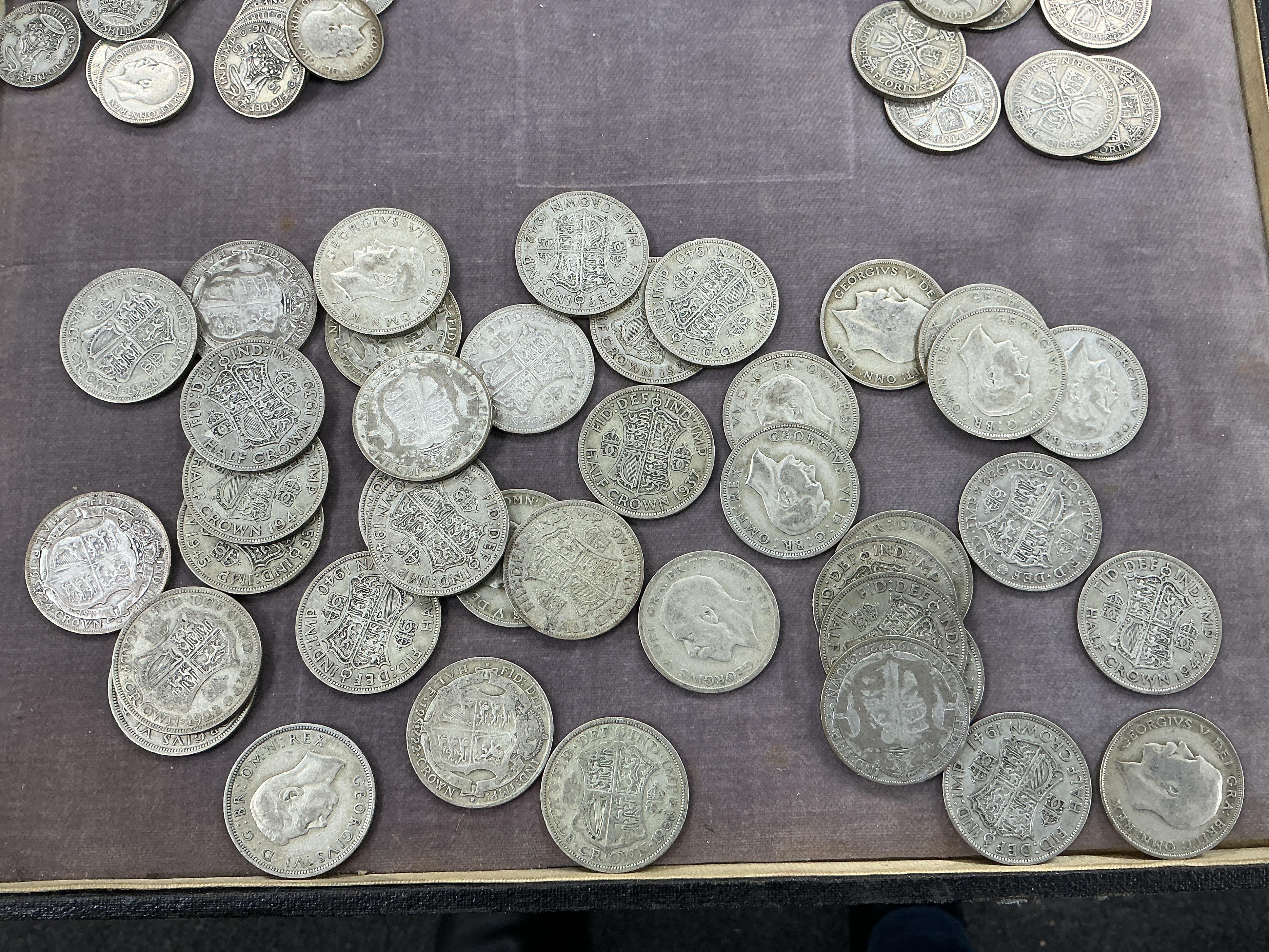 Lot 2066 , British silver coins, a large group of George V to George VI silver coins, 1920-46, comprising 40 half crowns, 10 Florins, 34 two shillings, 61 shillings, 35 sixpences and seven other coins