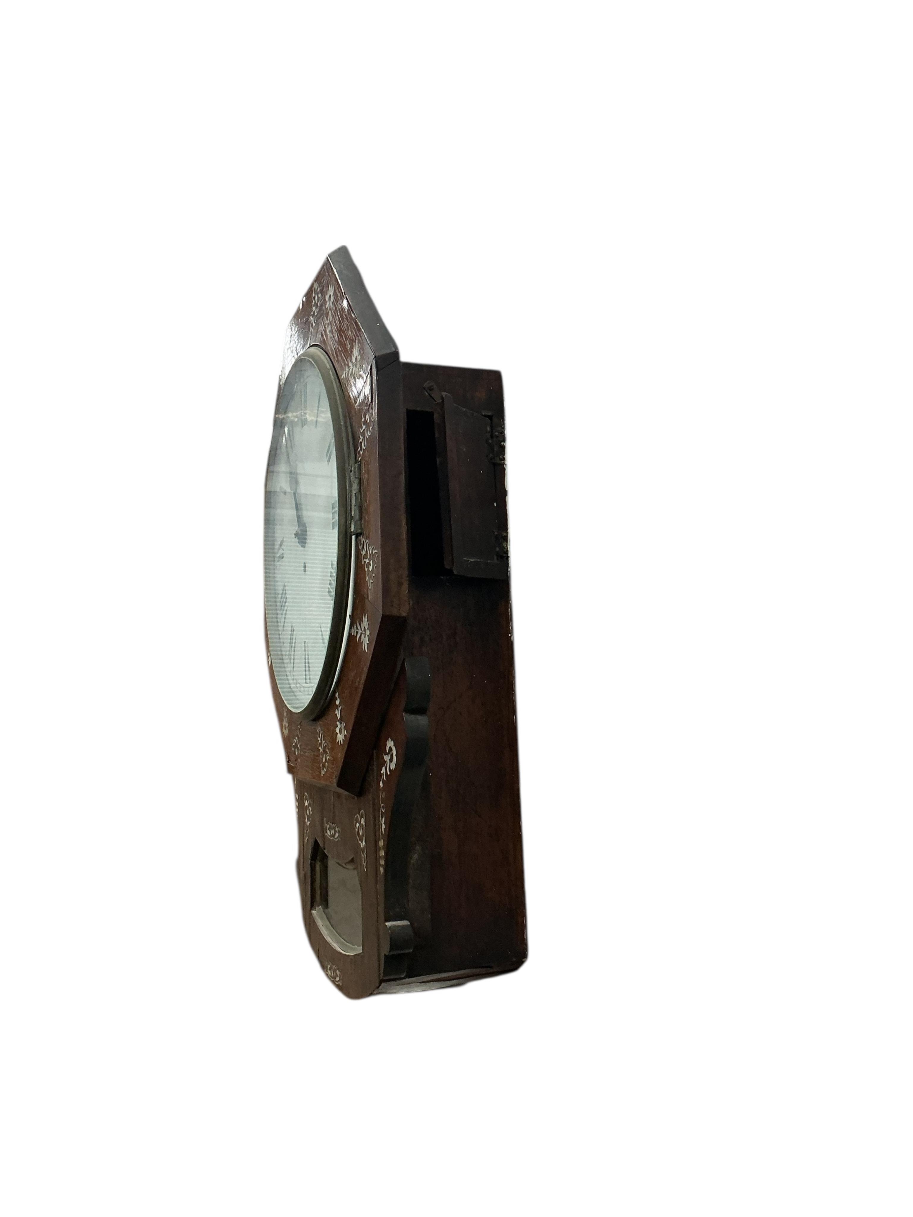 A Victorian rosewood and mother-of-pearl drop dial wall clock, width 45cm, depth 14cm, height 59cm