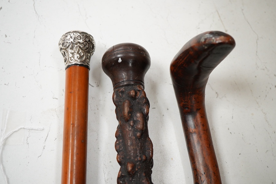 A collection of three 19th century walking sticks comprising a silver topped example and two hedgerow examples