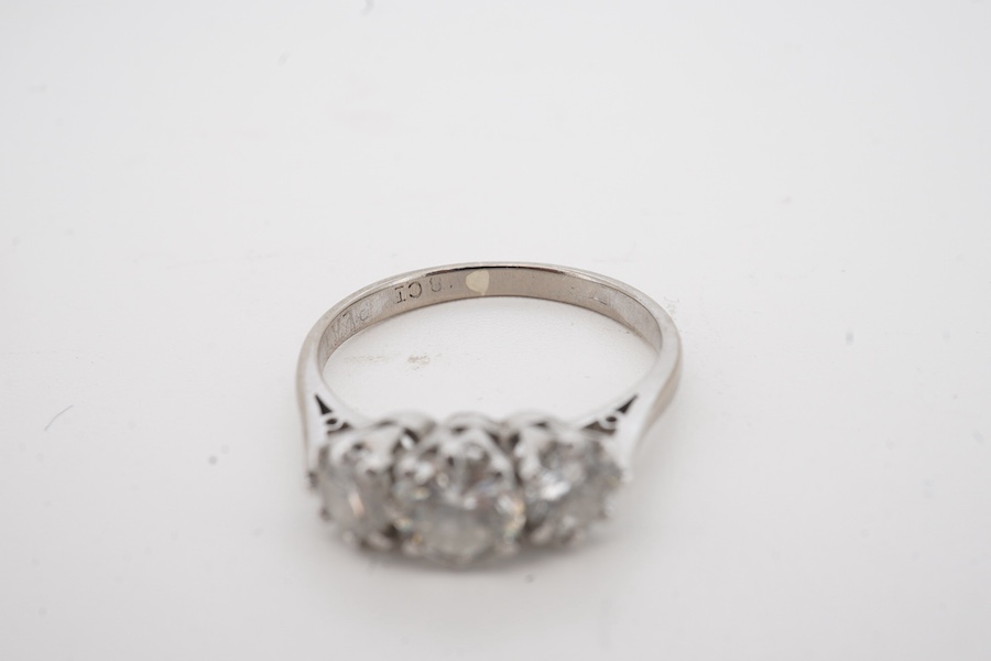 A three-stone diamond ring, mid 20th century, set with three brilliant-cut diamonds totalling approximately 1.60 carats, mounted in white gold and platinum, size L1/2, stamped 18ct PLAT, numbered 2787, gross weight approximately 3 grams