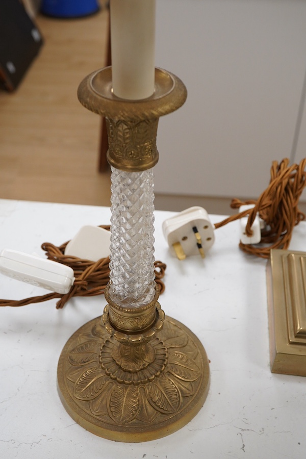 A pair of brass Corinthian column table lamps and another ornate brass and glass pair, tallest 41.5cm.