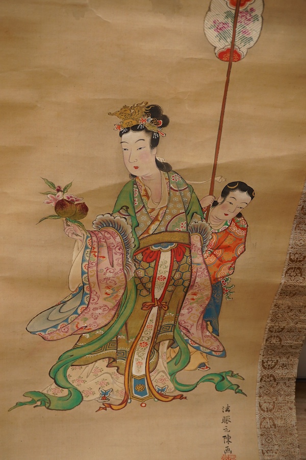 Lot 1417 , Japanese school, Meiji period, ink and colour on silk, scroll, with brocade borders, boxed, approx, 169 cm long x 147 cm wide