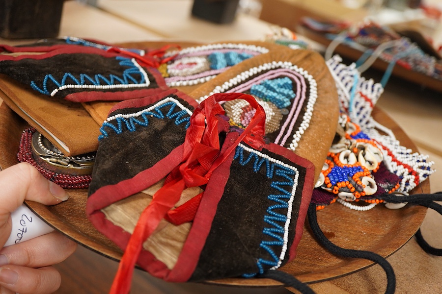 Lot 1494 , A pair of Victorian beadwork and suede slippers, other beadwork, shell and beadwork appliqué, etc., slippers 23cm (9)