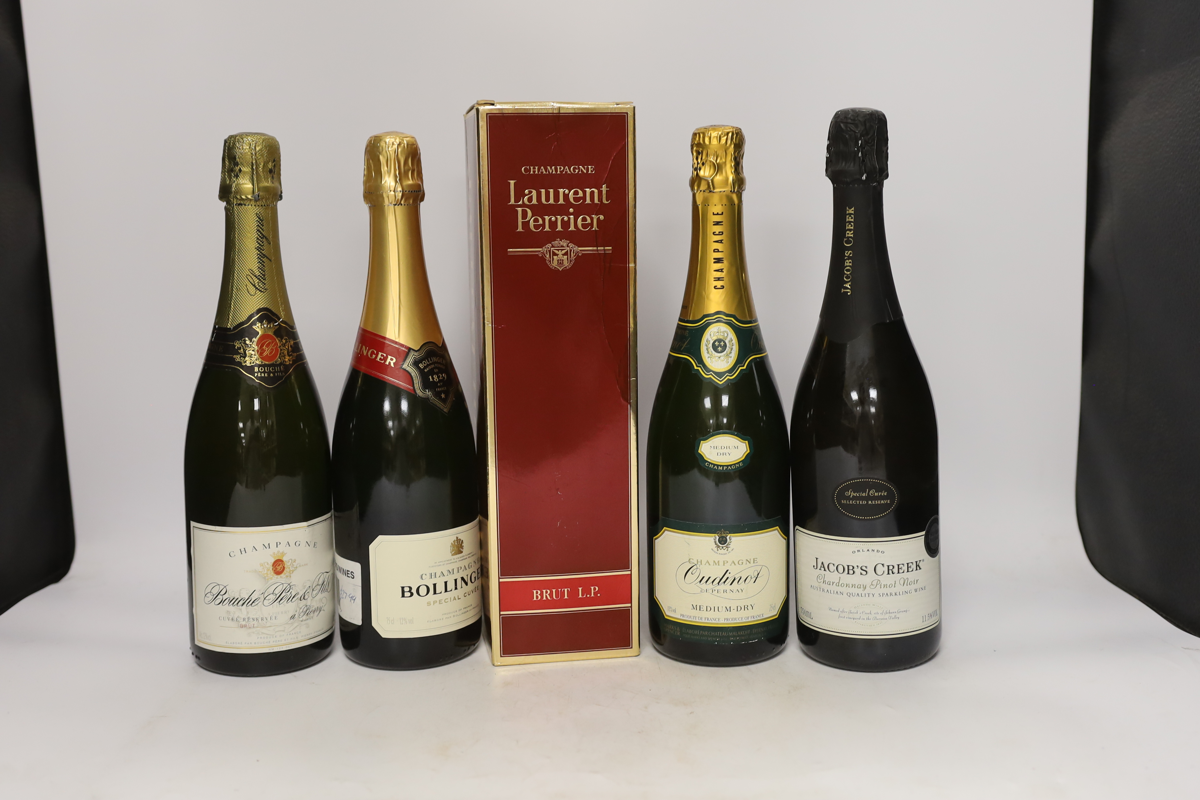 Seven various bottles of champagne, cava and sparkling wine including Laurent Perrier, Bollinger, Bouché Père & Fils etc.
