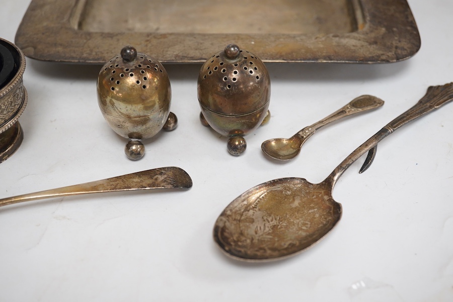 A German 925 butter dish stand(lacking glass insert), 20.2cm, together with an antique embossed white metal small mug (makers mark only), a pair of small silver pepperettes, a Victorian silver pedestal salt, an Indian white metal salt, a silver preserve spoon, a silver condiment spoon and a George III silver Old English pattern teaspoon.