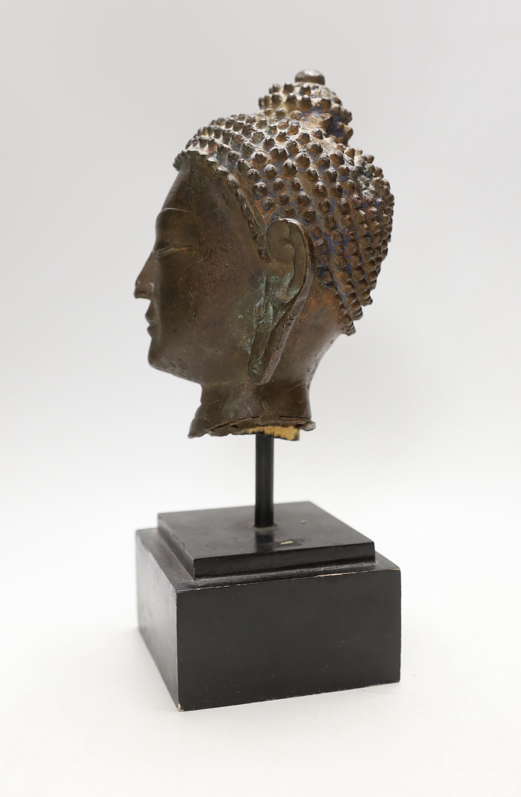 A Thai bronze Buddha head, 17th/18th century, on stand, by repute belonged to Alexander McQueen, 27cm