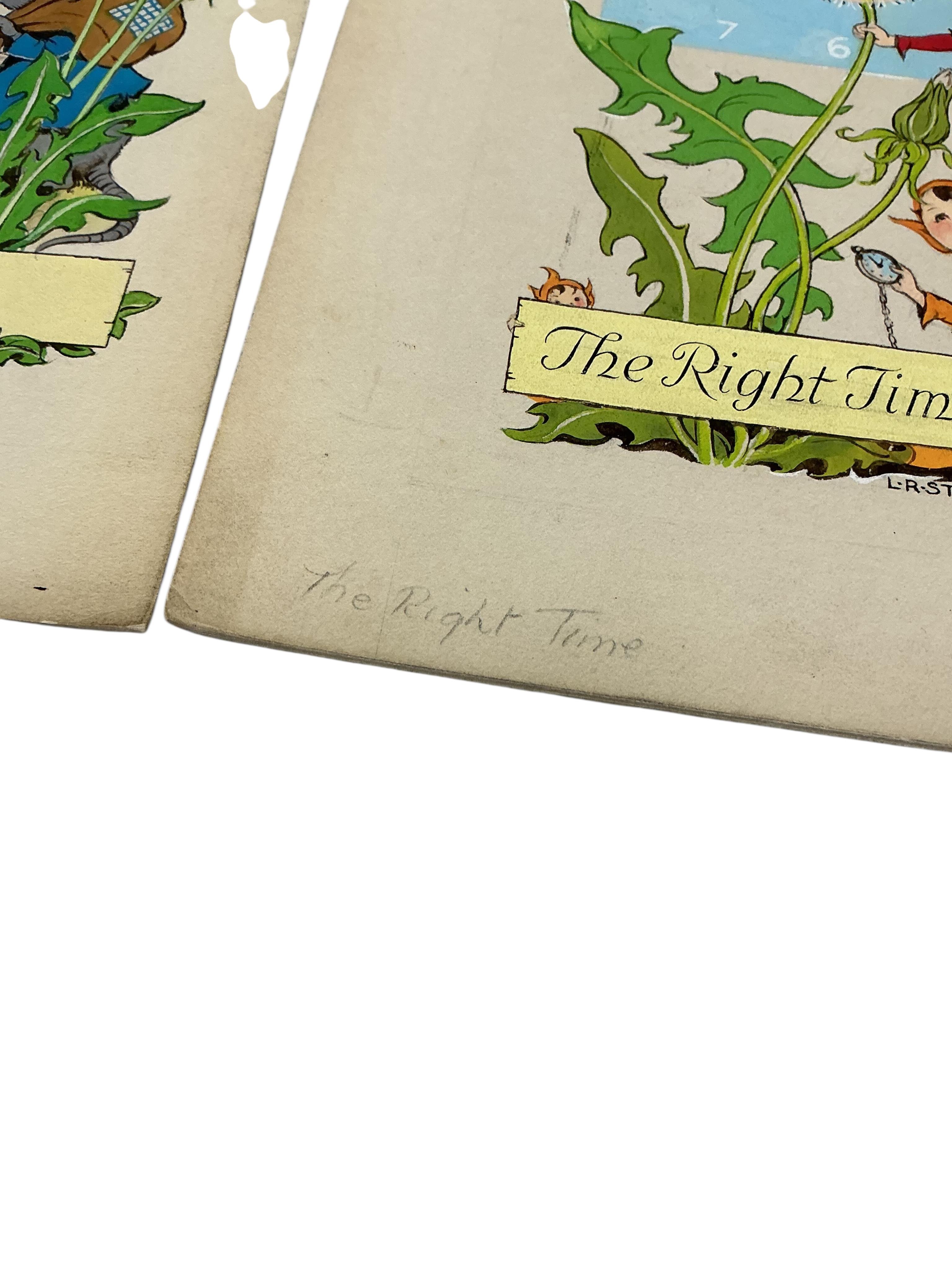 Lot 1746 , Lorna Steele (1902-1990), a set of five original watercolours for children’s postcard designs, to include ‘Pixie Market’, ‘A Windy Day’ and ‘Pixie Post’, each signed, unframed, largest 22 x 16cm