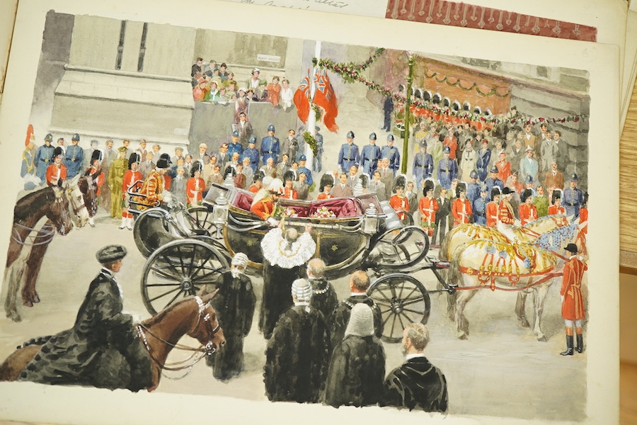 Charles Thomas Howard (1865–1942), a set of five original watercolours for postcard designs, Royal Pageantry scenes to include ‘A Royal Wedding’, ‘The Coronation’, ‘Speech from the Throne’ and ‘Arrival of the State Coach’, each with ink inscriptions attached, 22 x 32cm