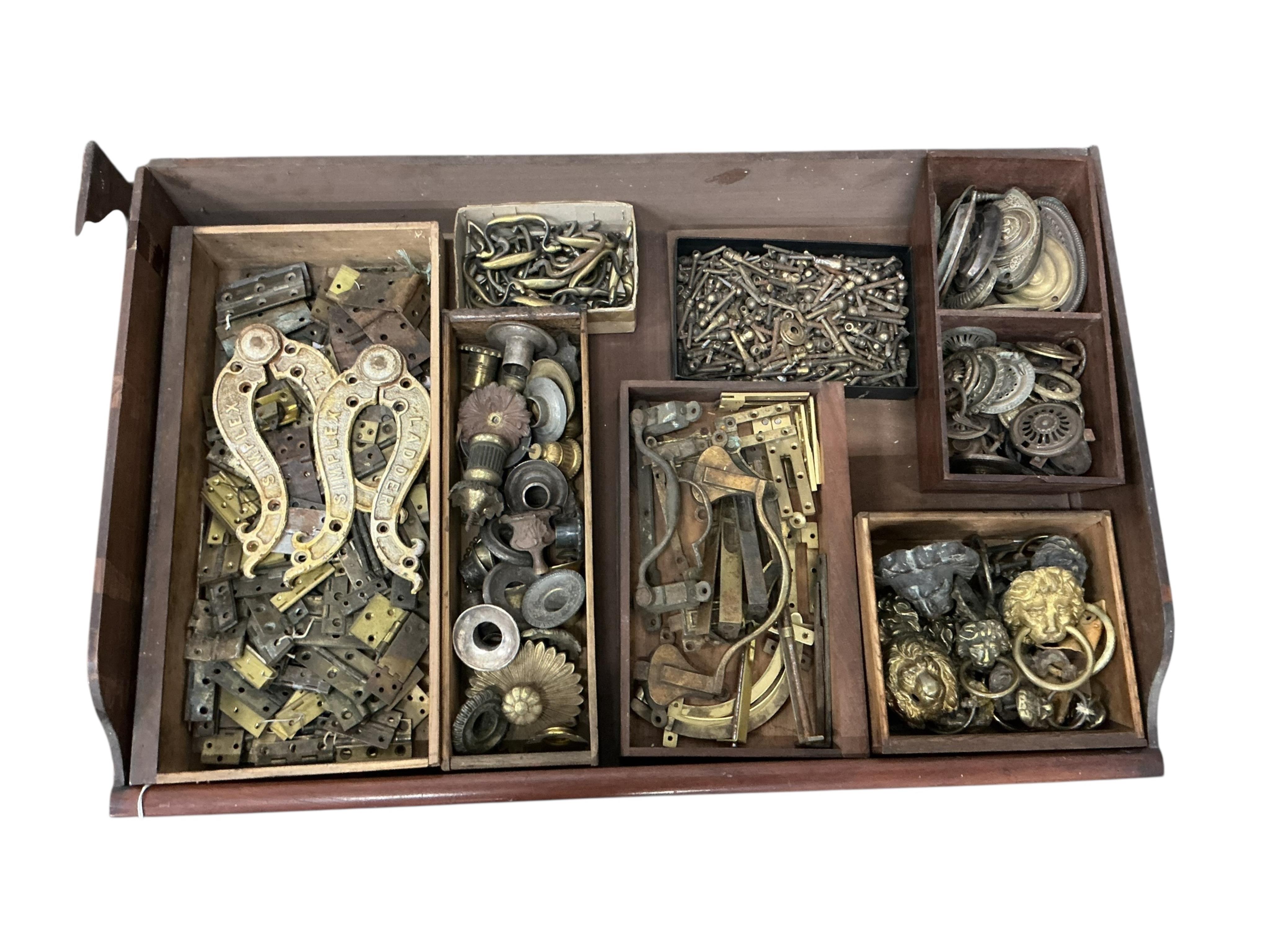Two trays of locks, hinges and handles, etc.