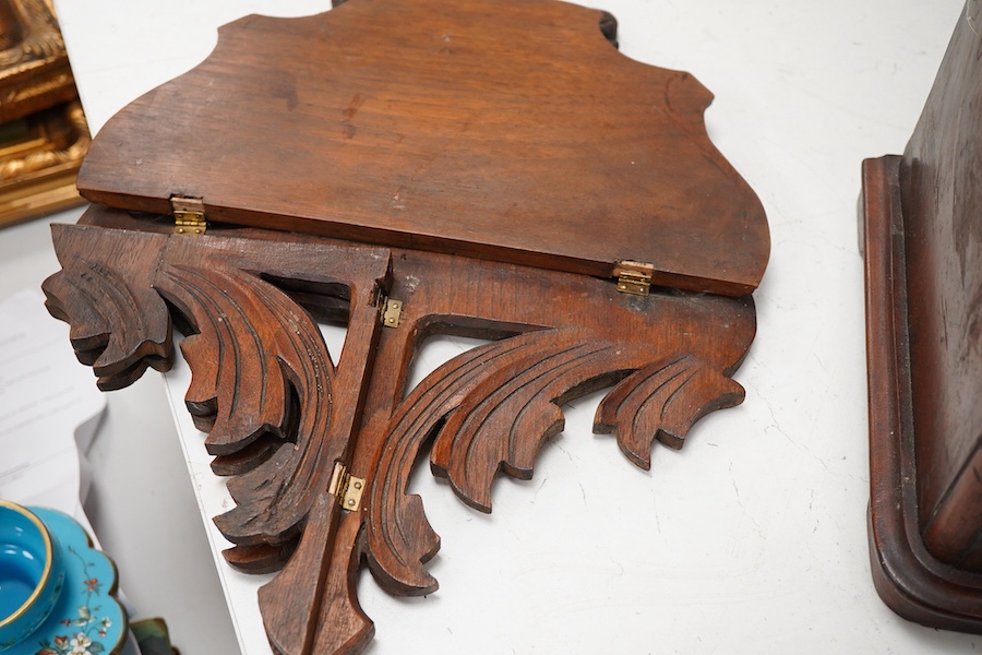 A mahogany and brass-mounted bracket, an oak candle-box, a carved folding shelf and Victorian miniature mahogany three drawer chest, 35cm high x 30cm wide at base x 19cm deep