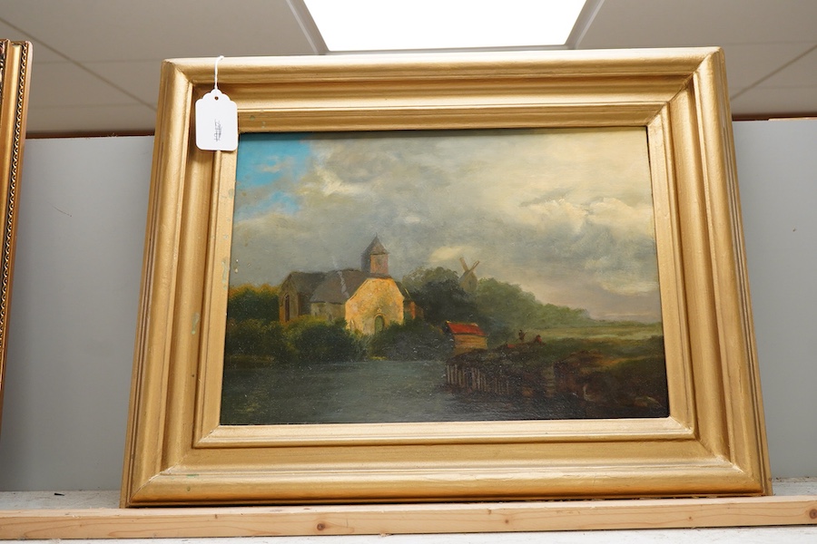 20th century school, riverscape with church and windmill beyond, oil on board, 27 x 37cm