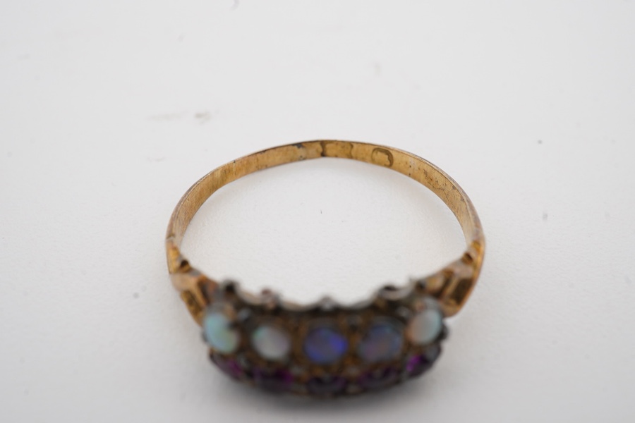 A garnet and opal ring, early 20th century, set with rows of cushion-shaped garnets and cabochon opals, in 18ct gold, size M, partial British hallmarks, gross weight approximately 1.5 grams