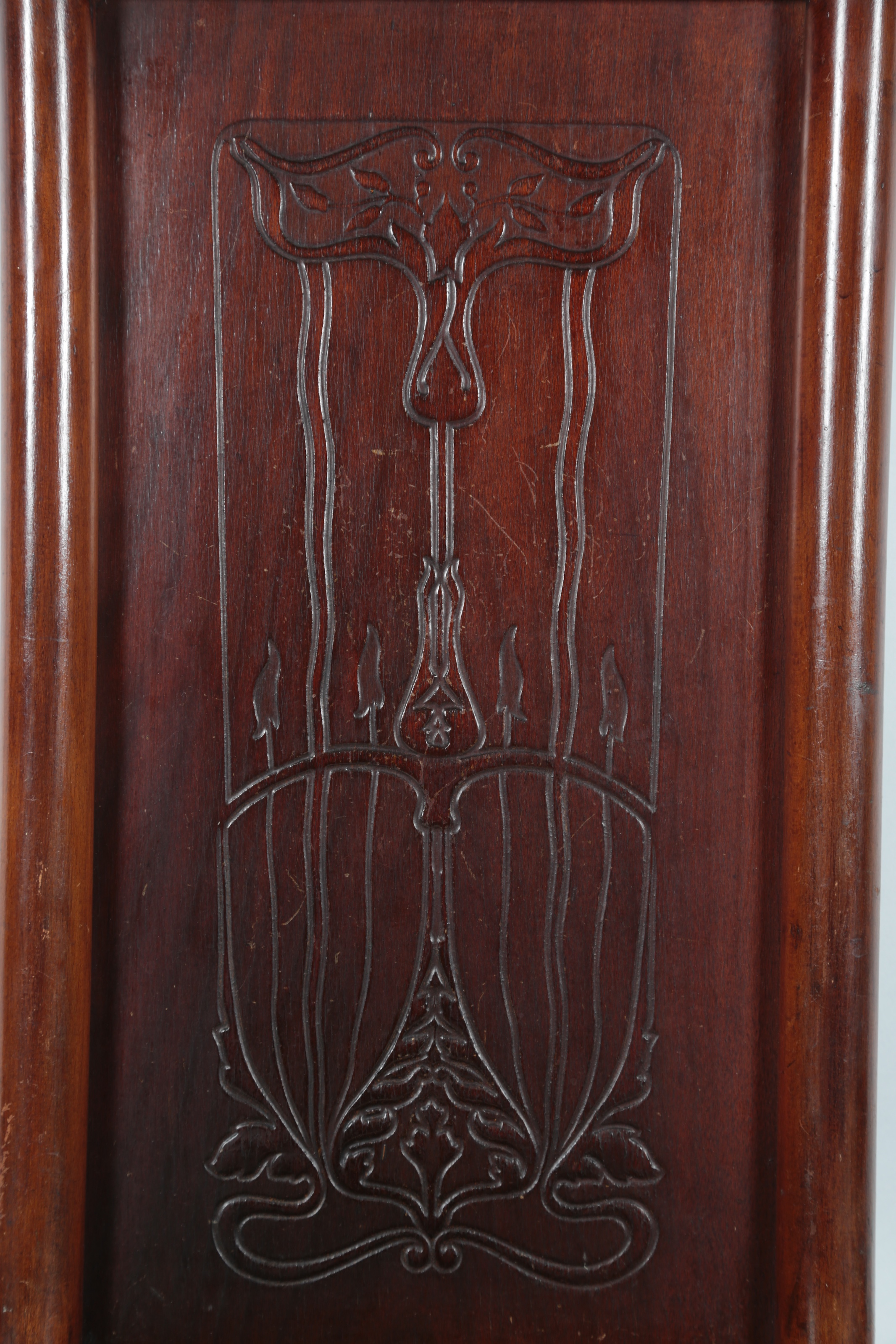 Thonet: An Art Nouveau hall stand, the arched crest rail surmounted by turned finials and fitted with four shaped hanging hooks above a gently curved crossbar, the central section inset with a rectangular bevelled mirror, flanked by a pair of scrolling coat hooks and above a carved panel decorated with a stylised foliate motif typical of the period, over a stretchered base with bentwood supports terminating in block feet, 209cm high x 97cm wide
