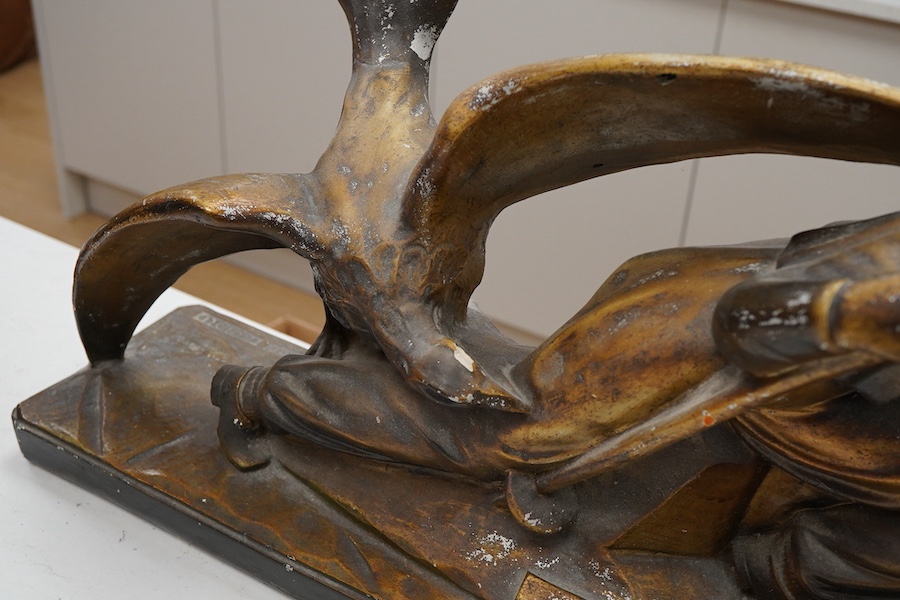 Lot 1431 , A large Art Deco gilt painted plaster model of a female skier amongst mountains, with a bird pecking her leg, 78cm wide
