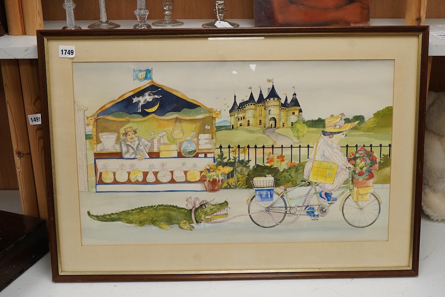 Lot 1749 , 20th century school, comical scene with a crocodile and figure on a bicycle, unsigned, ink and watercolour, 37 x 63cm