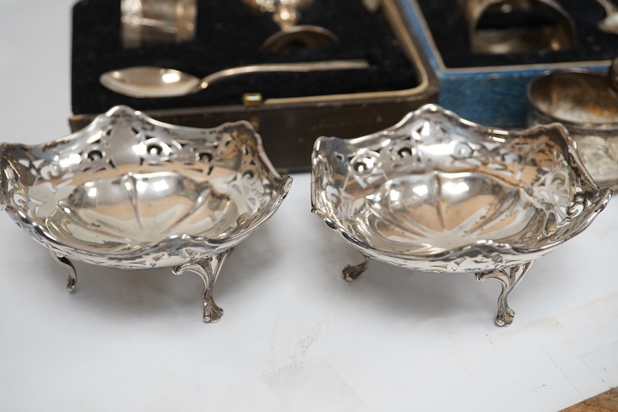 Two cased George V silver christening trios, including Deakin & Francis, Birmingham, 1827, together with a pair of George V pierced silver bonbon dishes and four napkin rings (three silver).
