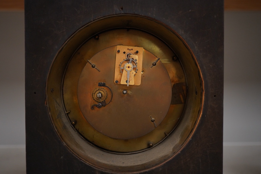 A 19th century French mahogany and brass mounted mantel clock, with enamelled dial, indistinctly inscribed, on claw feet, 30cm