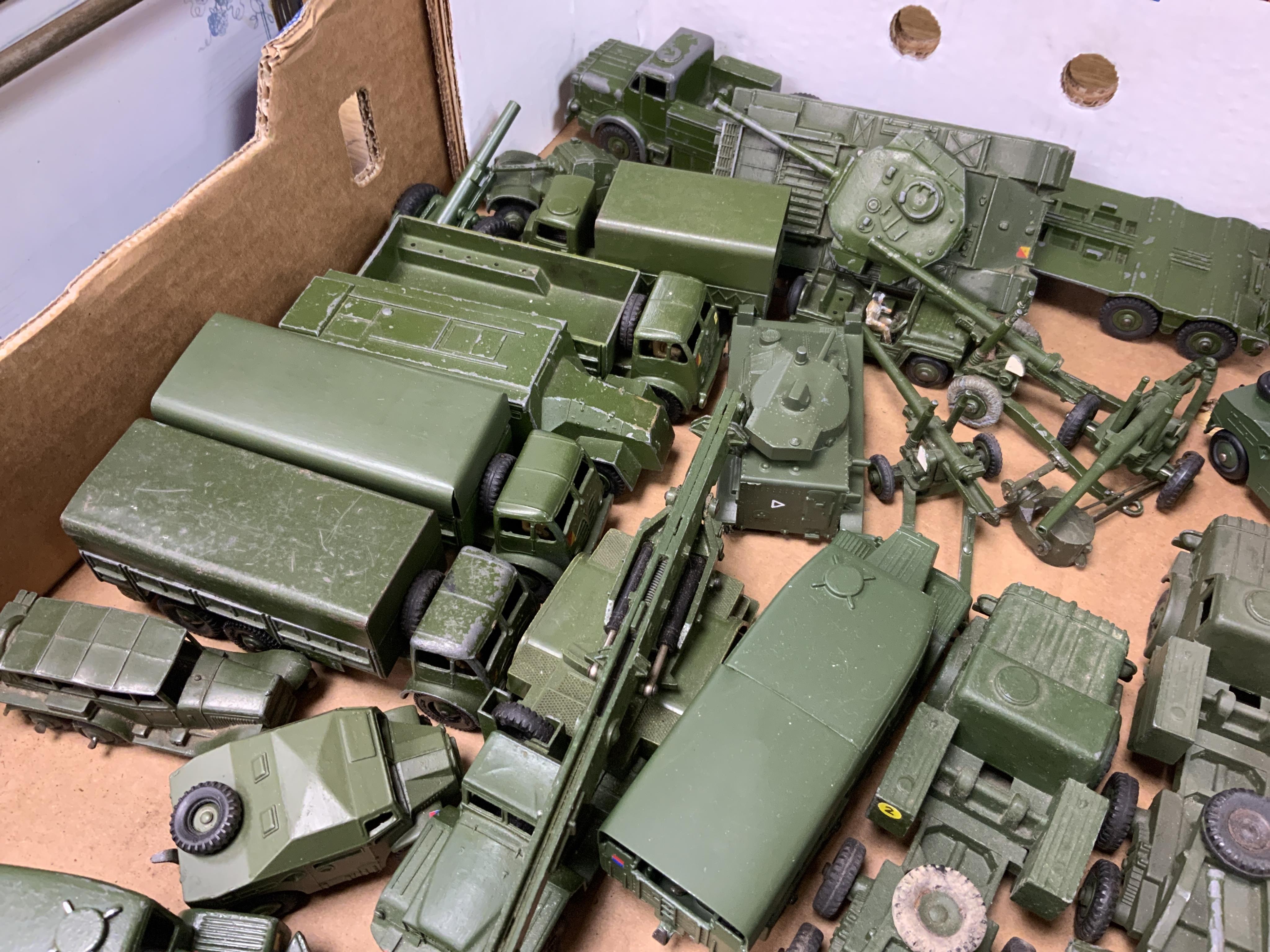 Lot 103 , Twenty-eight 1950s/60s Dinky Toys military vehicles, including; three Centurion tanks, three Mighty Antar tank transporters, 10 ton Army Truck, Medium Artillery Tractor, three 5.5 Medium Guns, etc.