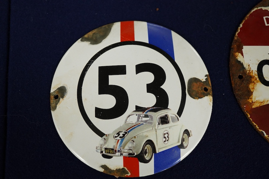 Three small enamel motoring signs; a Champion Spark Plug service advertising disc, diameter 15cm, a Wakefield Castrol Motor Oil advertising plaque, 12cm wide, and a modern enamel of Herbie