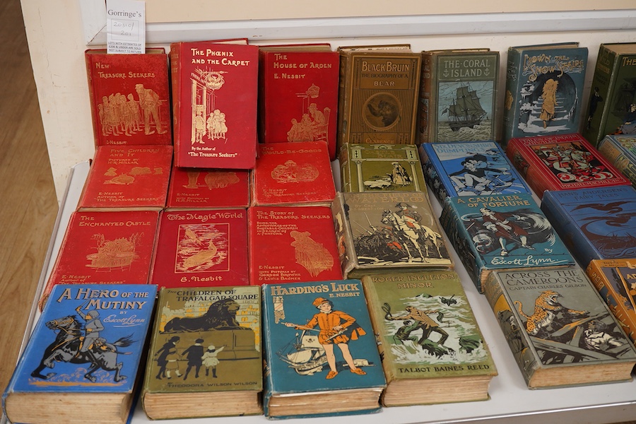 ° Children's Books - mostly later 19th / early 20th cent. with coloured pictorial cloth covers including: Sinclair's Holiday House (ca.1900), Strang's The Flying Boat (1912) and E.V. Lucas's The Slowcoach (1910) and 34 others (most are illus.) ; sold with 12 others by E Nesbit including The Story of the Treasure Seekers (8th imp, 1907); The New Treasure Seekers (1907; The House of Arden (1st ed, 1908); The Magic World (1st ed, 1912); The Phoenix and the Carpet (1st ed, 1908). (46)