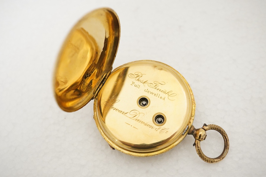 Lot 1102 , A late 19th/early 20th century engraved 18k open faced keywind fob watch, by Stewart Dawson &b Co, with yellow Roman dial and subsidiary seconds, case diameter 37mm, with two watch keys.