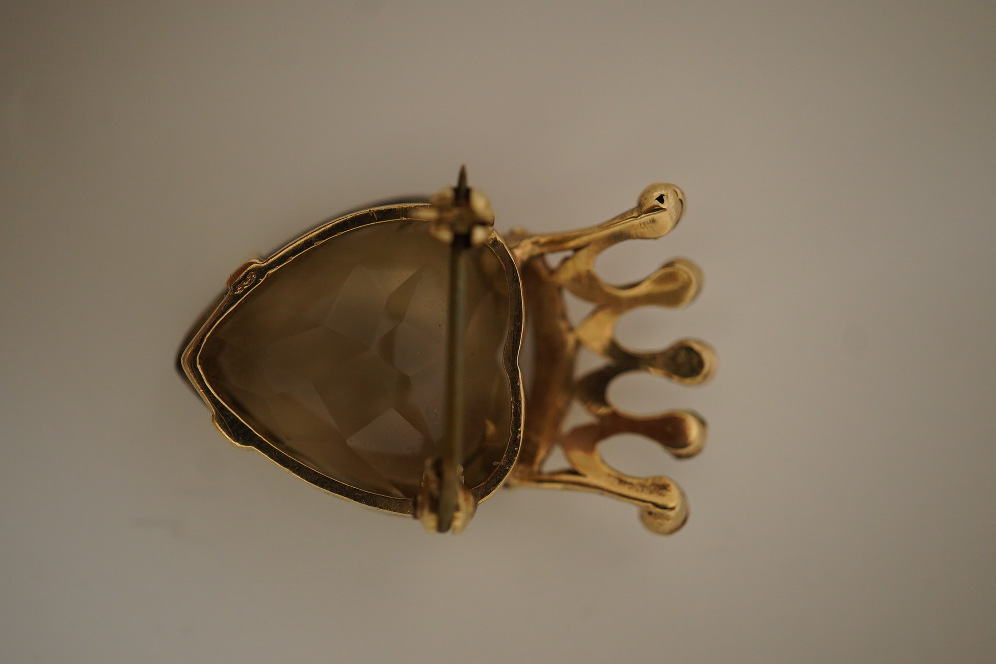 Lot 946 , A citrine and seed pearl brooch, circa 1970, designed as a crowned heart, set with a heart-shaped citrine, surmounted by a crown set with split seed pearls, mounted in 9ct gold, length 3.2cm, British hallmarks, base meta