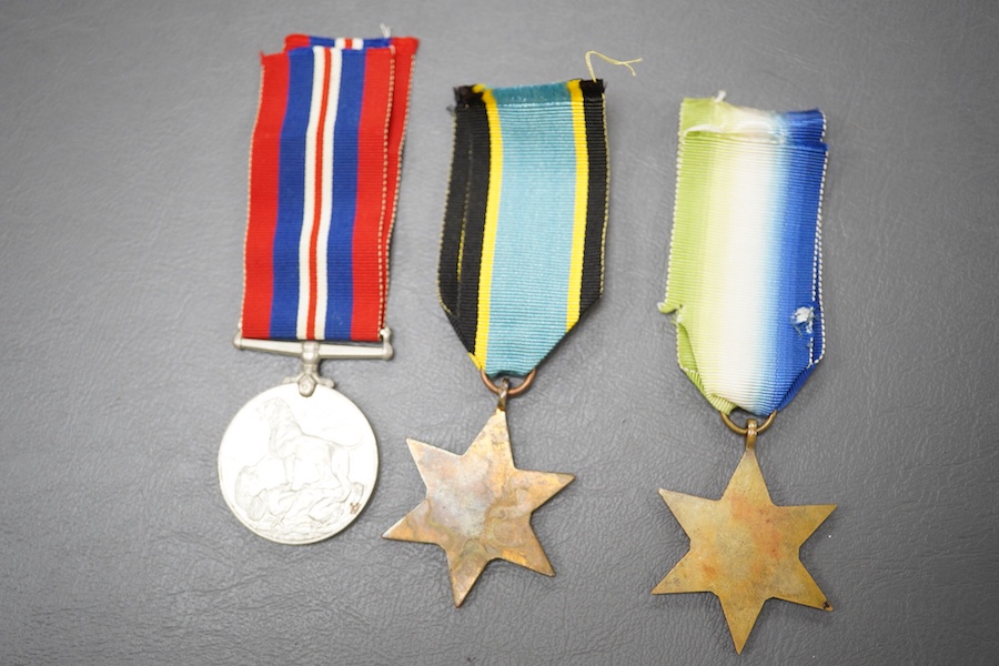 Three WWII medals; an Air Crew Europe star, an Atlantic Star, and a 1939-1945 medal