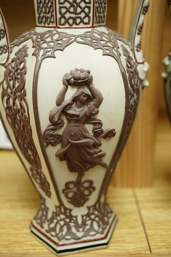A pair of 19th century Villeroy and Boch Mettlach Jasperware twin handled vases, 26cm high