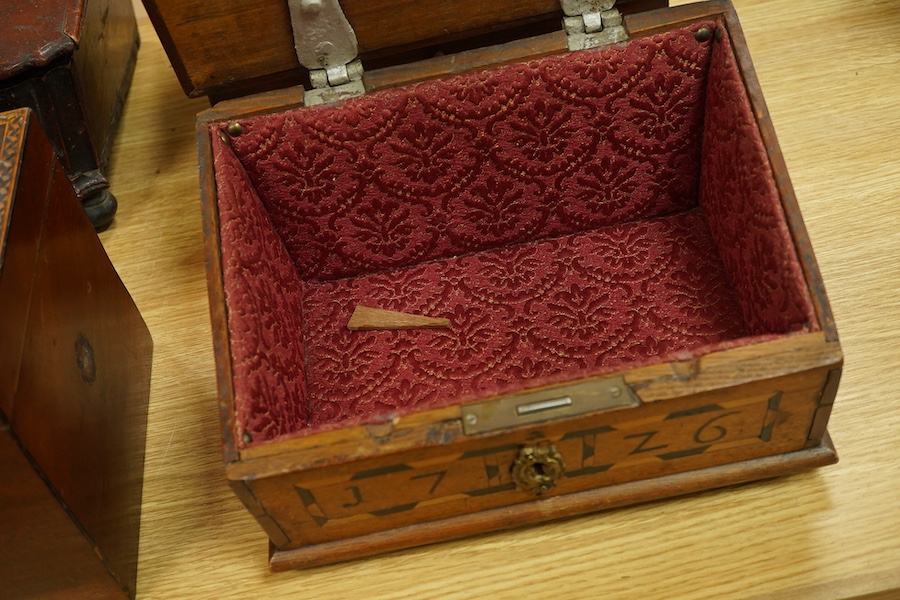 Four 18th century and later Danish boxes to include a marquetry inlaid example with sloped lid and a mahogany example, largest 30cm wide