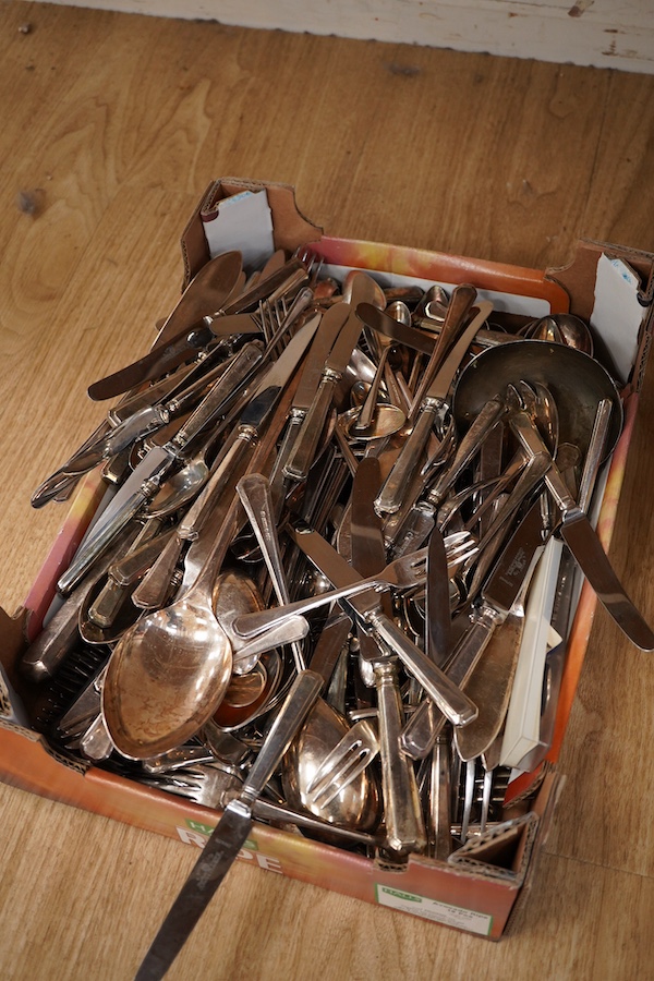 Lot 1517 , A collection of silver plate to include flatware, a set of goblets and a novelty glass and silver plated pot in the form of an apple