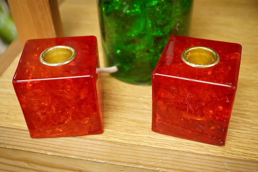 A Shatteline resin lamp base and a pair of candleholders, largest 13cm high