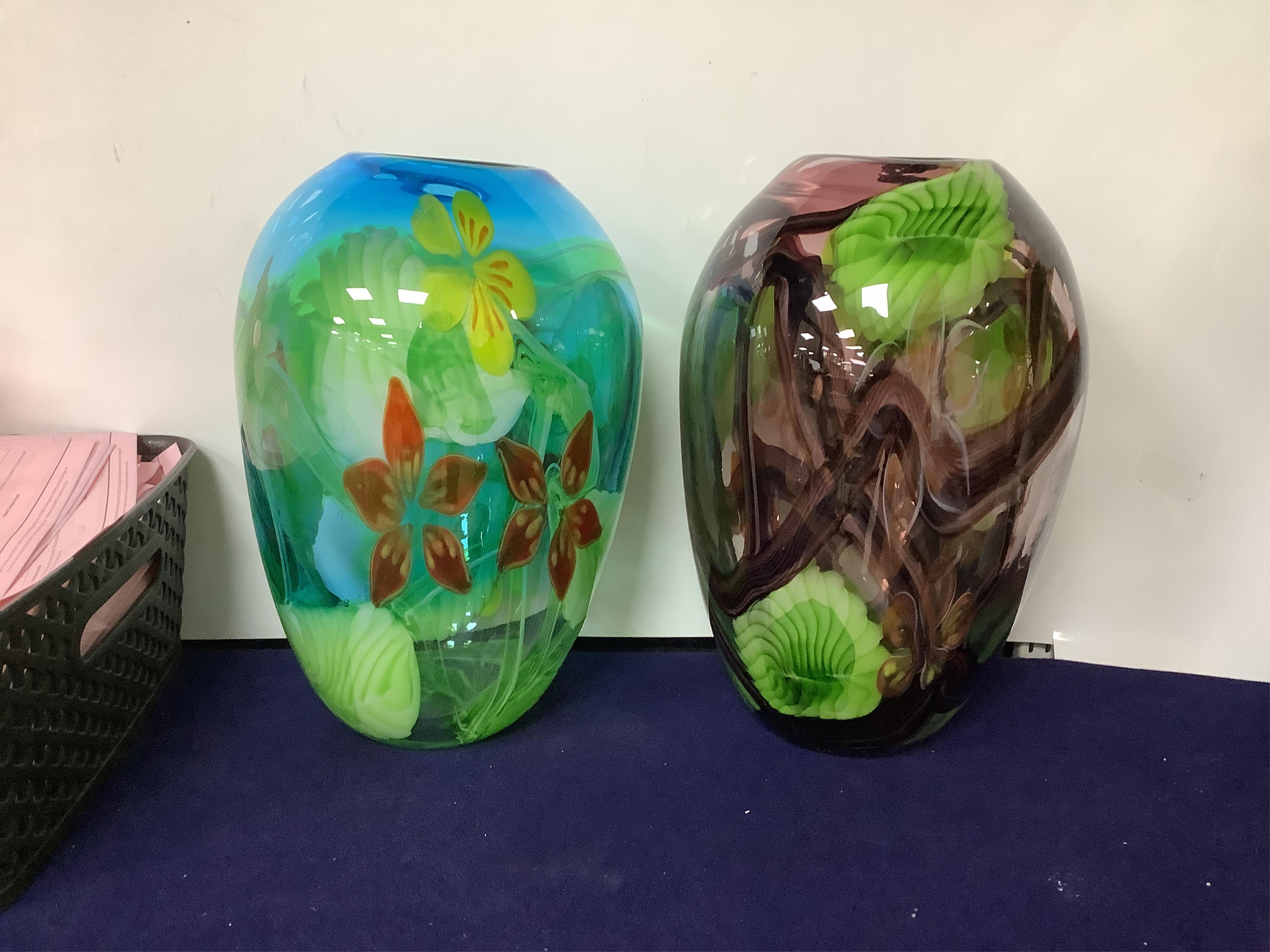 Lot 3156 , Two Murano coloured glass floral baluster vases, larger height 31cm.
