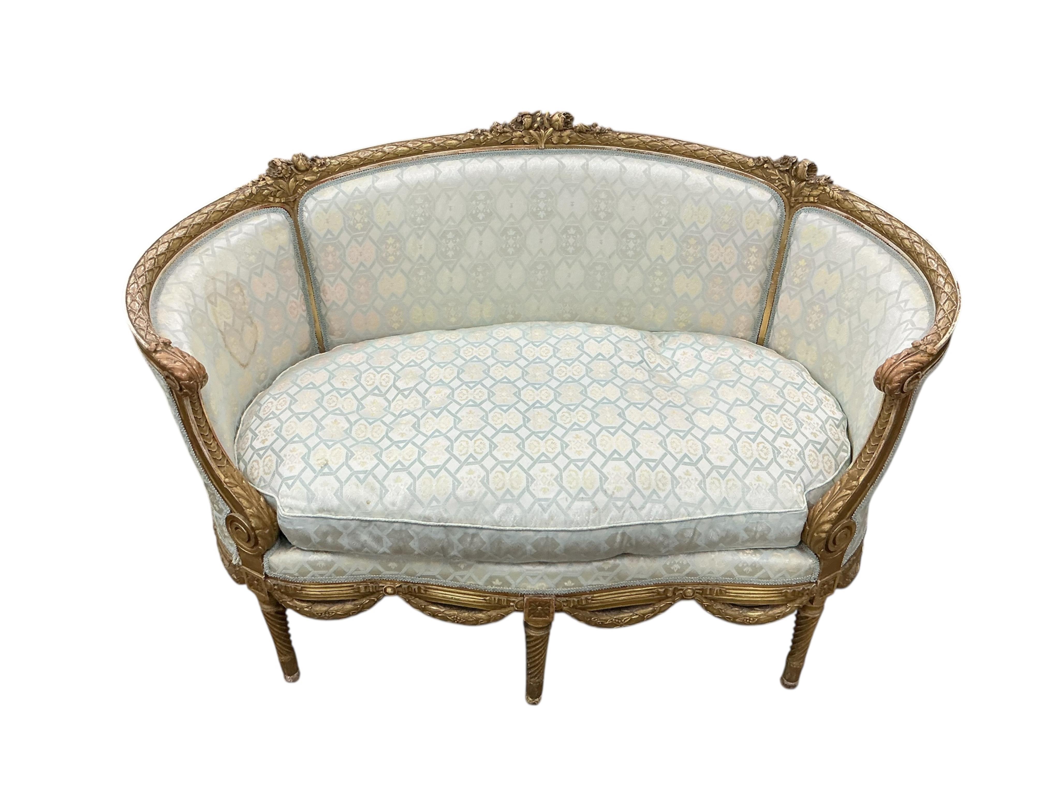 A French Louis XVI style two seater sofa or canapé, width 138cm, depth 55cm, height 88cm