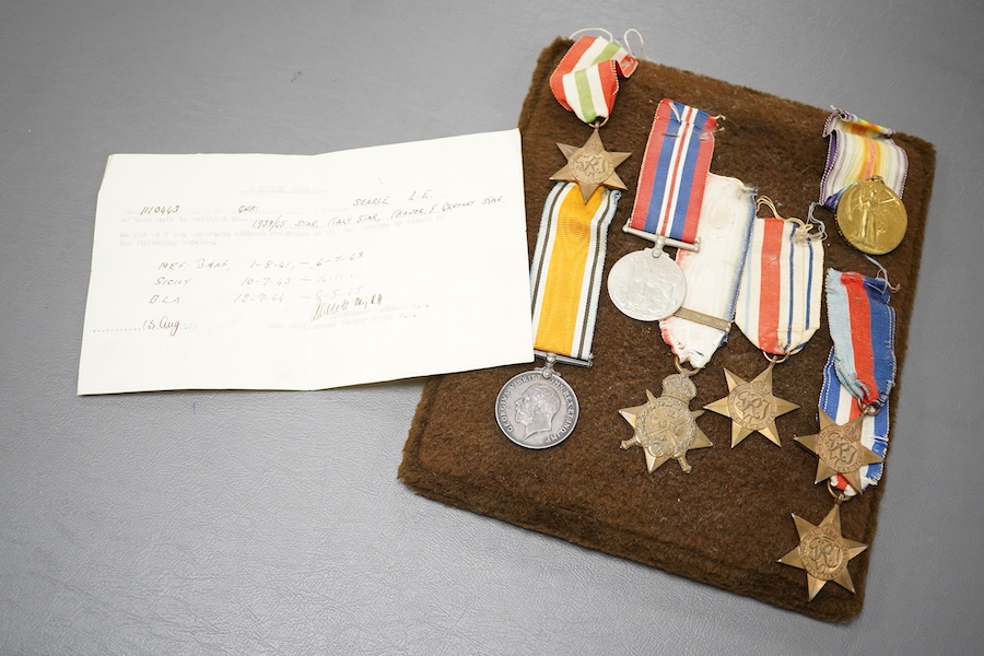 Eight military medals, understood to comprise of father and son groups; a First World War medal trio awarded to L-10098 Pte. F.G. Searle. Royal Sussex Reg., including a Mons Star with clasp for 5th Aug - 22nd Nov 1914, and five WWII medals including; The Italy star, The Africa star, The France and Germany star, The 1939-1945 star, and the 1939-1945 medal