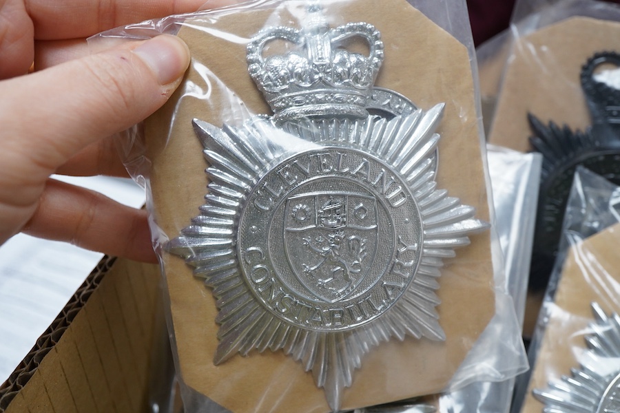 Lot 142 , North of England. A collection of police helmet plates & badges: Northumberland, Durham (County), Cleveland, Humberside, Barrow-In-Furness etc., (qty).