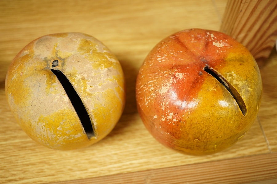 Two 19th century earthenware money boxes in the form of apples, 9cm in diameter